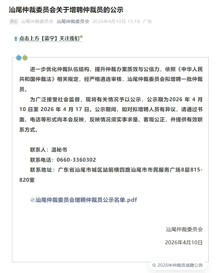 2026年4月17日,汕尾仲裁委员会拟增聘仲裁员公示期正式结束。经严格遴选审核,京师深圳律所付正谋、高稳、李莉、廖明磊、秦文涛、容韵雅、叶梦蕾、张明利、赵宝莲、周定元、邹湘雩十一位律师成功入选仲裁员名单。(按首字母排序)