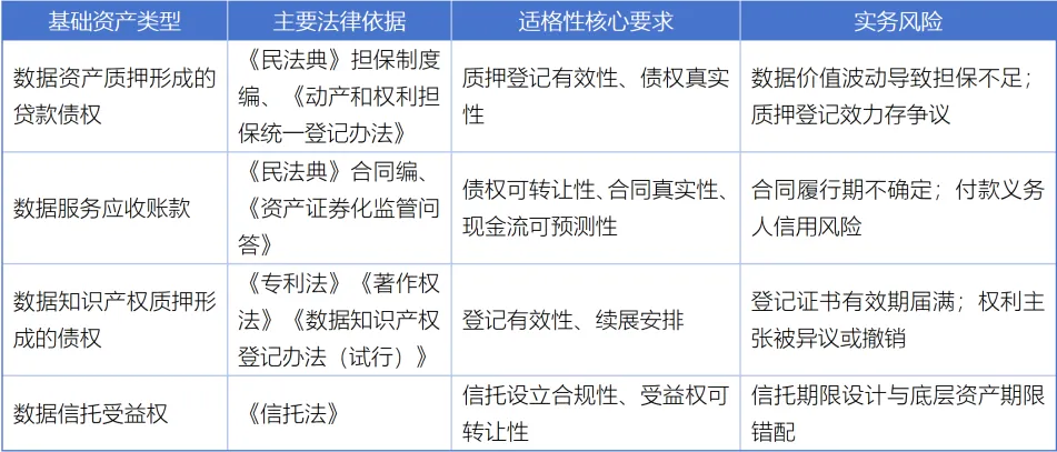 结合当前已落地的数据资产ABS实践,基础资产类型主要集中于两类:一是以数据资产为质押物的信托贷款或保理融资产生的债权;二是基于数据服务合同形成的应收账款。两类资产的证券化适格性存在明显差异: