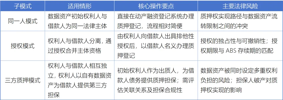 该模式下,律师需重点关注两个层面的法律问题:一是应收账款的可转让性与债务人确认程序;二是数据资产质押的登记效力,权利质押的设立须以交付或登记为生效要件,数据资产的质押登记路径目前主要依托动产融资统一登记公示系统,但其与数据知识产权登记体系的衔接问题尚存一定法律不确定性,须在法律意见书中作出详尽分析与必要的风险揭示。