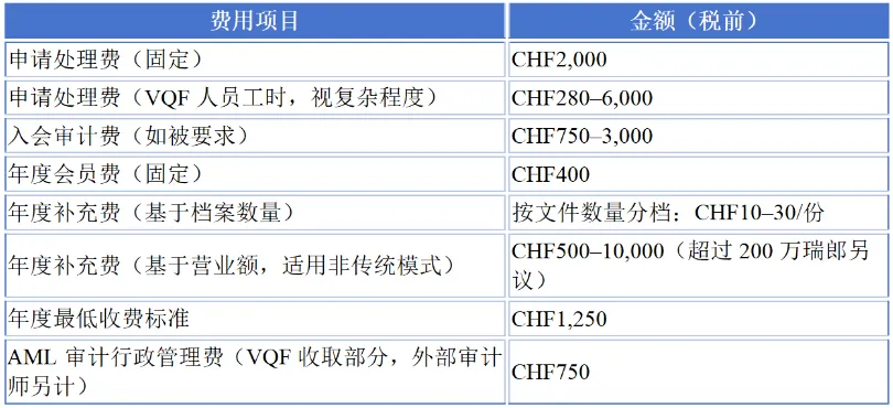 VQF官网(https://www.vqf.ch/en/vqf/regulation-on-fees)说明,其全部收费项目载于《收费规章》(Regulation on Fees,Doc-No. 1101.5),现行版本自2025年1月1日起施行。根据该公开收费文件,主要费用项目如下: